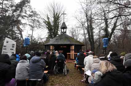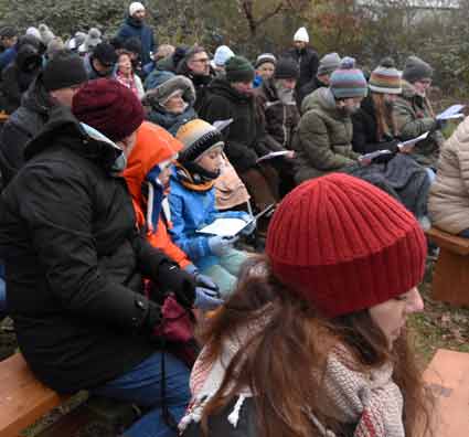 Tradition hat der Heiligabend-Gottesdient in der aus den Jahren des Protestes gegen den Bau der Startbahn West stammenden Hüttenkirche am Vitrolles-Ring zwischen Mörfelden und Walldorf. Gestaltet wurde dieser Gottesdienst von Pfarrer Jochen Mühl (Bild 2) von der evangelischen Kirchengemeinde Walldorf und Aktiven dieser Gemeinde. Thematisch im Mittelpunkt stand die weihnachtliche Botschaft von Toleranz und Empathie, bewusst auch gegen aktuellen Machtspiele und Gewaltphantasien aktueller Oberer in Ost und West gerichtet, wogegen einfühlsam bei dem musikalisch vom Chor Xang unter Leitung von Ralf Baitinger (Bild 4)/ umrahmten Gottesdienst die weihnachtliche Botschaft für Frieden und Eintreten für Schwächere gestellt wurde. Die Rahmenbedingungen beim Heilig Abend 2025 an der Hüttenkirche wurden bei dieser Freiluftveranstaltung durch eisige Kälte bestimmt. Dennoch nahmen rund 250 Besucherinnen, darunter viele Familien, an diesem etwas anderen Gottesdienst teil.