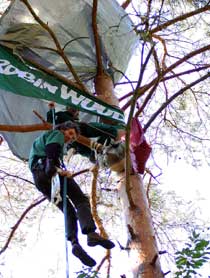der letzte der drei Robin Woodler von dem Baum ab, auf dem
