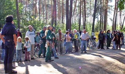 hilft beim Abtransport des luftigen Heims. Unten: Gespannt verfolgen Ausbaugegner das Geschehen