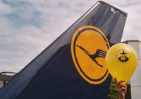 RadlerInnen an der Schwanzflosse der Lufthansa auf dem Flughafen.