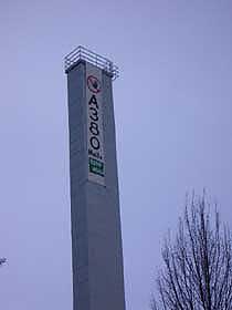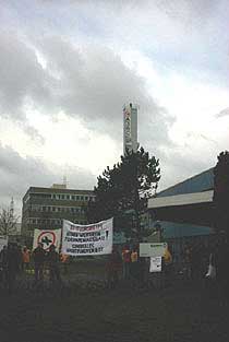 am Schornstein des Gebäudes ein großflächiges Transparent.