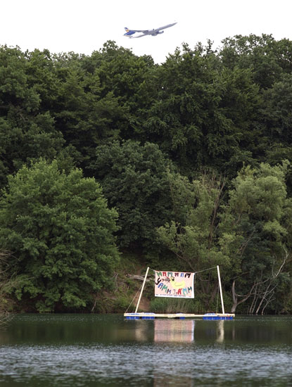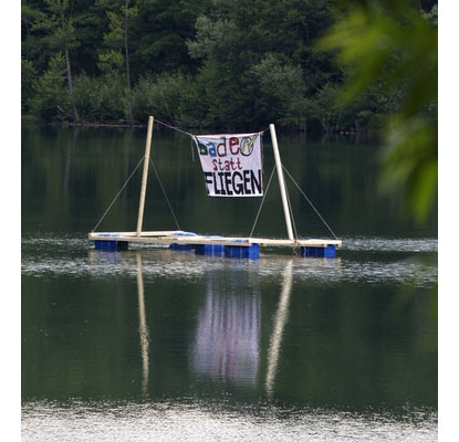 Vor zwei Wochen wurde deshalb der Wald von Umweltaktivisten und Bürgern dauerhaft besetzt. Wir begrüßen, daß außerdem eine weitere kreative Aktion unabhängiger Umweltschützer aus der Rhein-Main Region stattgefunden hat. Als Zeichen der Solidarisierung wurde ein Floss mit Transparent auf dem Kelsterbacher Mönchwaldsee errichtet. Der See grenzt unmittelbar an die vom Ausbau betroffene Bannwaldfläche an und wird im Sommer von vielen Menschen zur Naherholung genutzt. Der See würde durch den Ausbau seine Erholungs- und Ruhe Funktion völlig verlieren. Das Floss ist mit Transparenten versehen und setzt ein Zeichen gegen den Verlust des Ökosystems.