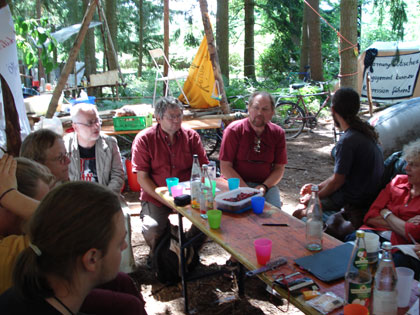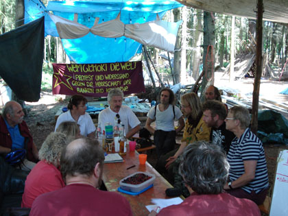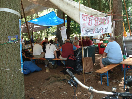 Als Zeichen Ihrer Solidarität mit der Waldbesetzung fand die öffentliche Fraktionssitzung der FAG (Flughafenausbaugegner) Frankfurt heute im Waldcamp statt.