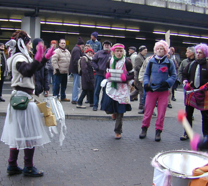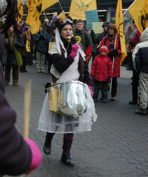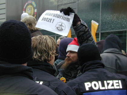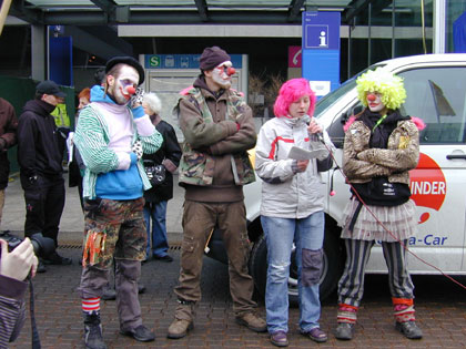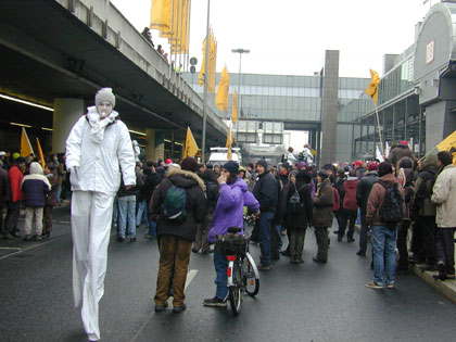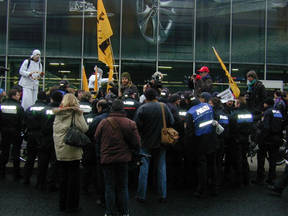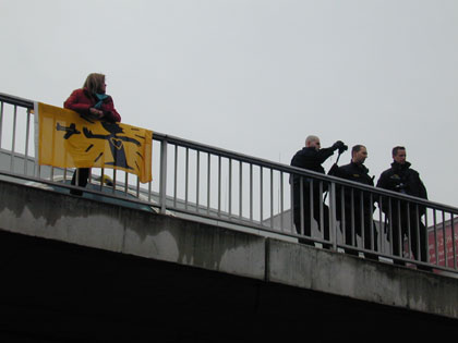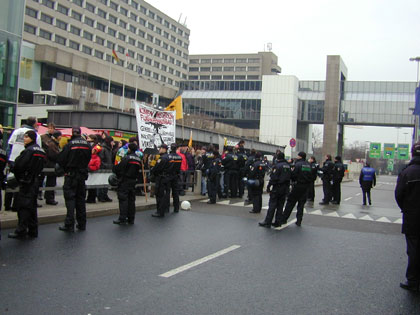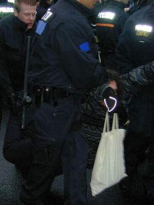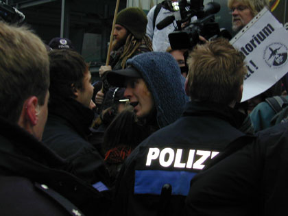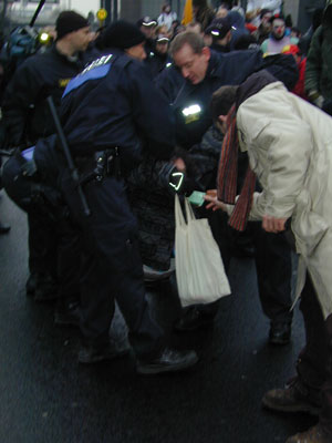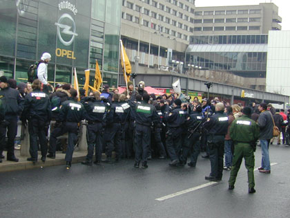 Zum Schluß blockiert nur noch einer die Straße: Die Polizei. Die DemonstrantInnen sind abgedrängt, doch immer noch ist die Straße gesperrt |
