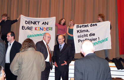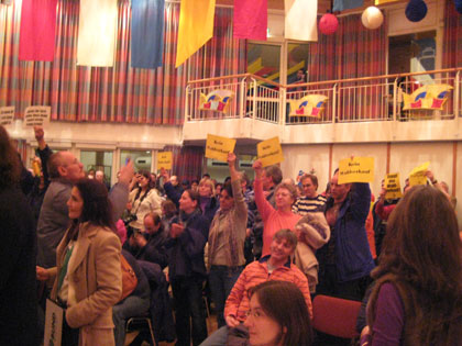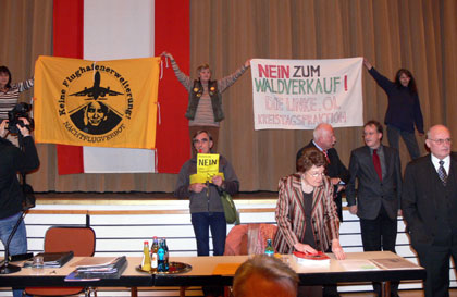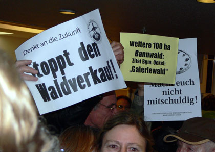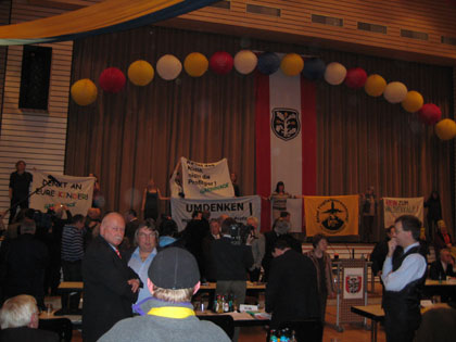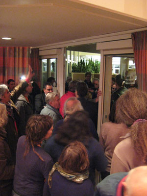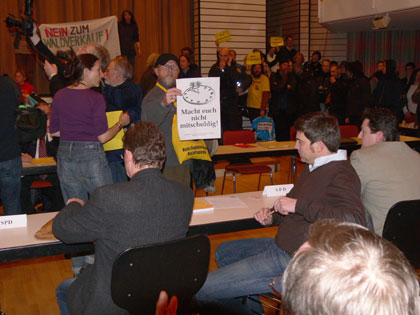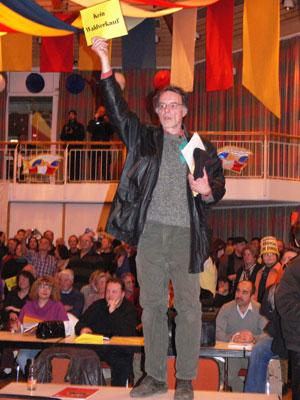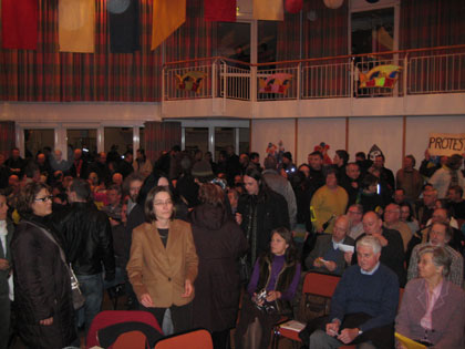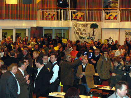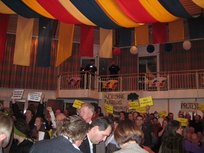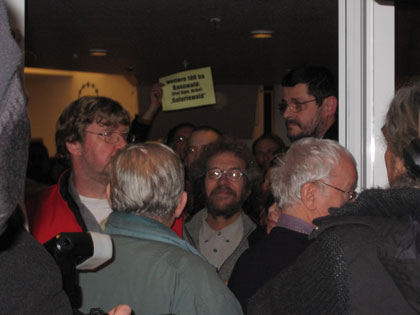 Gedränge am Eingang: Trotz Behinderung durch städtische Angestellte gelang es allen BürgerInnen, in den Saal zu kommen. Die Emporen durften übrigens nicht vom Volk genutzt werden. Dort standen Polizei und Security. Die Abstimmung fand an einem für Karneval geschmückten Ort statt. Unter der Schirmherrschaft der Narren stimmten die Abgeordneten von CDU und SPD für die Fraport AG. |