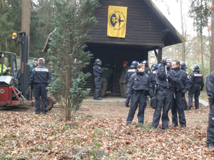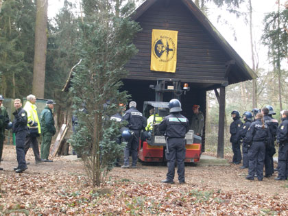 Die Polizei räumt den Pflanzgarten und die Försterhütte. Ein Aktivist hat sich darin zurückgezogen. Die Polizei bearbeitet mit Äxten die Tür - vergeblich. Auf einmal fährt ein Gabelstapler, mit dem die Fraport AG sonst ihre Zaunsegmente transportiert, heran und stellt sich vor der Tür auf. Wir schreien und rütteln am Zaun, um die die Aktion zu unterbinden, mehr aber noch um den Mann zu warnen. Es ist durchaus Praxis, sich an einer Verbarrikadierung anzuketten und wir wissen nicht, wo sich der Aktivist genau befindet. Kein "Kommunikator" der Polizei ist zu sehen. Es ist völlig unverständlich, warum die Aktion mit einer solchen Eile durchgezogen wird. In "Amtshilfe" rammt der Fraport-Fahrer seine Stapelgabeln in die Tür, die daraufhin nachgibt. Der Aktivist im Innern der Hütte wird - äußerlich unversehrt - festgenommen. Abends im Hessischen Rundfunk ist die entscheidende Szene mit dem Gabelstapler nicht zu sehen. Der Zuschauer muß glauben, die Polizei hätte die Tür mit der Axt geöffnet und die Waldcamp-Leute hätten grundlos "randaliert".
