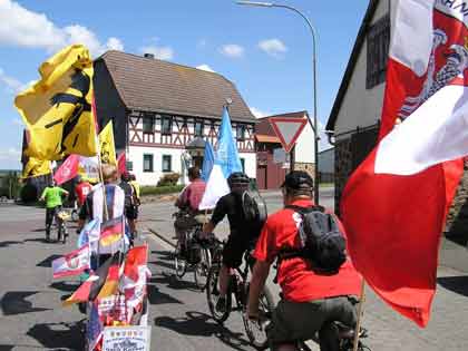 Wie gestern wurde, immer wenn wir durch Ansiedlungen kamen, der Fluglärm über die guten Dachlautsprecher, eine Leihgabe der Gewerkschaft über Dieter Tanke, Kelsterbach organisiert, der Fluglärm simuliert. Allerdings ist es zu erheblich weniger Kundgebungen gekommen, weil in viele Dörfern kaum eine Seele auf der Straße war.