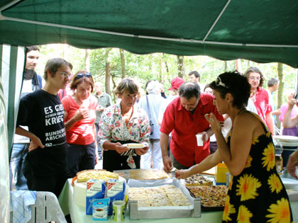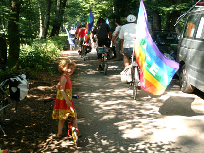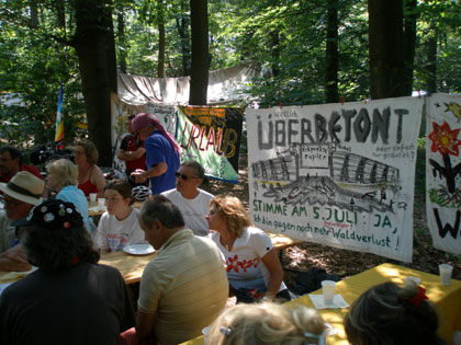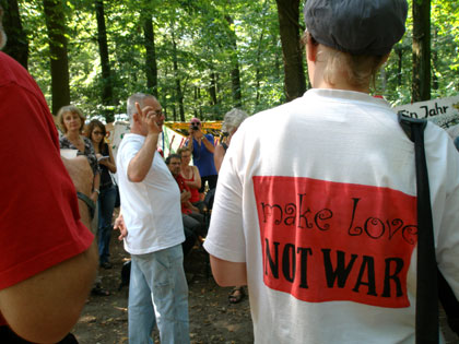 Mit leichter Verspätung -"das ist von Frankfurt ja weiter weg als wir dachten"-trafen am Nachmittag des 5.8. fünfundzwanzig RadfahrerInnen im Kelsterbacher Wald ein. Die meisten Räder waren mit der bekannten Regenbogen-Friedensfahne ausgerüstet. Die DFG-VK Bayern führt jährlich eine Fahrradtour durch, auf der sie militärische Brennpunkte, aber auch Orte gelungener Rüstungskonversion und Plätze zivilen Ungehorsams besucht.