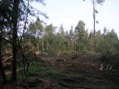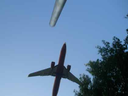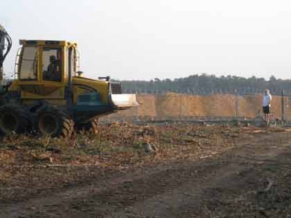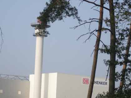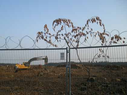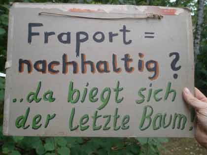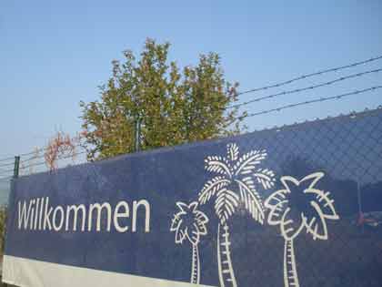 Zynismus pur: Hinter dem Wilkommens-Transparent mit Palmen befindet sich ein Parkplatz für Fluggäste auf dem ehemaligen Bauhof-Gelände . Ein Parkplatz, direkt am Ausbau im Süden, der sich immer weiter in den Wald frißt. Das Urlaubs-feeling , das hier durch den Sichtschutz aufkommen soll, verdeckt die traurige Wahrheit der Zerstörung eines der letzten zusammen hängenden Waldgebiete im Rhein-Main-Gebiet. Also ab in den Urlaub, damit man das Unglück hier nicht sieht und schnell noch ein wenig zur Erwärmung des Klimas mittels Co2-Emissionen und Kondensstreifen beigetragen! |