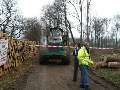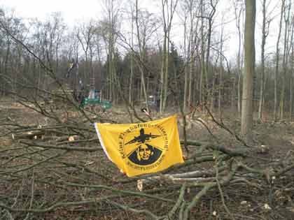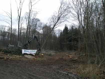 Die am Montag begonnenen Rodungsarbeiten für die Verlegung der B 7 und das Flughafenvorfeld wurden fortgesetzt. Betroffen sind z.Zt. 13 Hektar Buchen - Eichen-Mischwald. Das meiste steht noch. Es sind zwei Harvester im Einsatz, der Beschriftung nach sind sie vom selben Auftragnehmer wie in Kelsterbach. Die Rodungsschneise beginnt gegenüber der Einmündung der Landstrasse von Grebenstein auf die B 7 etwa zwei Kilometer nördlich von Calden. Es war kein Wachschutz und keine Polizei da, allerdings zwei -durchaus freundliche- Leute von der Bauüberwachung. Sie erzählten, dass sie sich gewundert haben, dass die Rodungen am Montag ohne Proteste begonnen hätten - beeilten sich aber nachzuschieben, das sie darüber nicht unglücklich wären..... Reaktionen der Passanten gingen von "endlich gehts los" über "hier bin ich immer mit meinem Hund spazieren gegangen" bis zu: "für Profit machen die alles, und wenns der totale Blödsinn ist".
