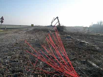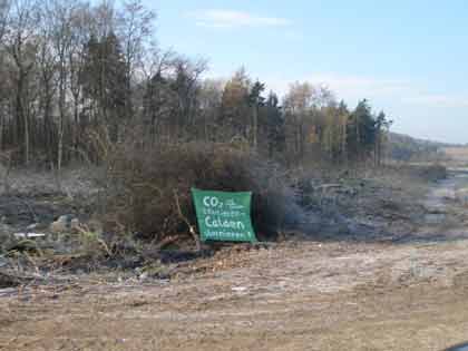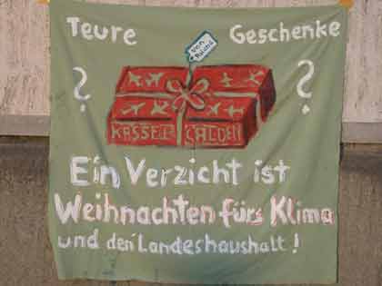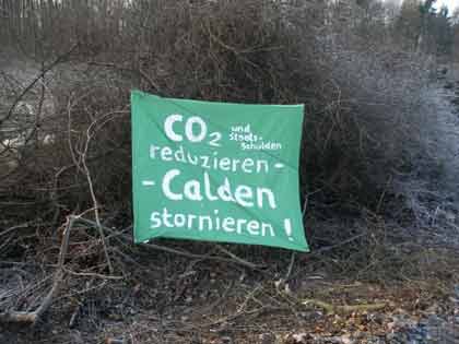 Nach drei Wochen Rodung ist nun die gesamte Trasse für die Verlegung der B 7 nördlich von Calden baumfrei. Unter dem Motto "Keine Koch-Geschenke -Verzicht auf Calden wäre wie Weihnachten fürs Klima" kam es am 19.12.09 zu einer kleinen friedlichen Störaktion mit anschliessendem Polizeieinsatz. Die Flugplatzmanagerin sprach ein unbefristetes Betretungsverbot aus.