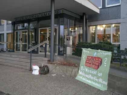 Daraufhin wurde die Aktion vor das Regierungspräsidium in Kassel am Steinweg verlagert. Das RP hat erheblichen Anteil an der Realisierung des Flughafenprojekts. Das gesamte Genehmigungsverfahren wurde im Zeitraum der Koch-Alleinregierung gerichtsfest durchgeboxt. Mittels Befehlshierarchie wurden die hausinternen KritikerInnen kaltgestellt. "Die zeitnahe Umsetzung der grossen Infrastrukturprojekte" nennt der seit 2009 im Amt befindliche Regierungspräsident Dr. Walter Lübcke als sein vorrangis Ziel. Neben Calden ist damit vor allem die A 44 und ein Kraftwerk in Mecklar gemeint. Vizepräsident Hans Peter Conrad sieht einen Wandel seiner Behörde von einer Aufsichts- zu einer Dienstleistungsbehörde für Umwelt und Wirtschaft. Konkret für Calden bedeutet dies, dass das RP einen gemeinsamen Planungsstab mit der Flughafen GmbH bildet und diese damit auch von vielen Aufgaben finanziell entlastet.
