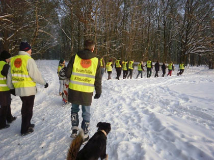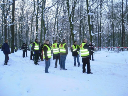 Im Wald angekommen, teilen wir uns in vier Gruppen auf. Zwei Gruppen, die Leute mit Kindern und Hunden, bleiben auf den Wegen und bewegen sich auf die Polizeiautos zu. Die anderen schlagen sich quer durch das Gehölz auf die 300 Meter breite Rodungsfläche durch. Sie ist nicht eingezäunt.