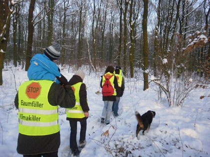 Weit gefehlt. Kind, Kegel, Hund und Protest-Plakate sprechen eine andere Sprache. Hier treffen sich BewohnerInnen von Waggum und aus Braunschweig zum Waldverteidigungs-Spaziergang. Auf den Westen steht: "Baumfäller - Klimakiller"
