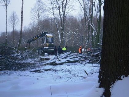Ziel ist es, an die Harvester heranzukommen und die Rodungsarbeiten zu unterbrechen. Andere Demonstranten zücken Kameras und dokumentieren, das Bäume verbotenerweise gefällt worden sind. Sie tragen -bzw. trugen- eine Schonungs-Kennzeichnung wegen vorhandener Nisthöhlen.