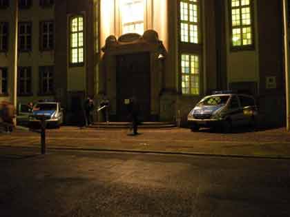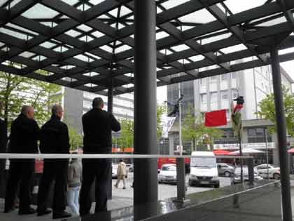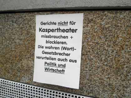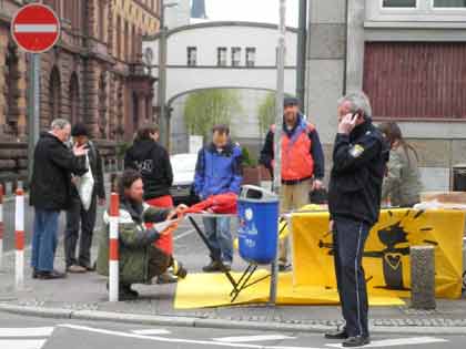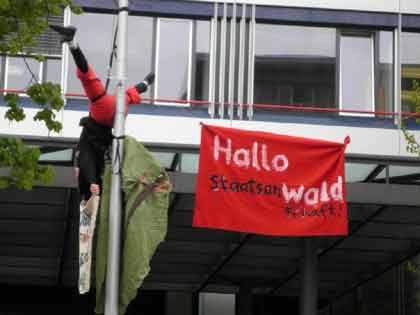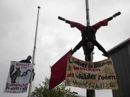 Mit dem Aufbau des Info-Punkts an der Gerichtsstrasse hatte der Tag für uns begonnen - und mit einer kleinen Aktion. Ziel war es, viele Flugblätter unter die Passanten zu bringen. Das geht nur, wenn wir Interesse erzeugen. Vor der Staatsanwaltschaft, die an unserem Hiersein nicht ganz unbeteiligt ist, stehen drei Fahnenmasten. Ehe die Polizei hinguckt, sind sie erklommen und ein Transparent "HALLO StaatsanWALDschaft !" ist aufgespannt. Die Passanten auf der belebten hinteren Zeil bleiben stehen, gucken -und nehmen neugierig die Flugis.