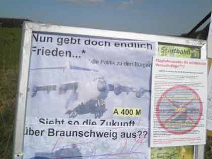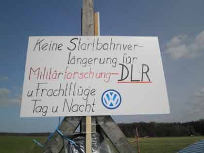 Ebenso wurde bekannt, dass die DLR (Deutsche Gesellschaft für Luft- und Raumfahrt) die Startbahnverlängerung wünscht, um in Braunschweig u.a. Tests an dem neuen Militärtransportflugzeug A 400-M durchführen zu können. Bei einem eilig einberufenen Pro-Ausbau- Happening mit Flugzeugtaufe am 15.4. 2010 betonte DLR-Vorstandschef Prof. Dr. J.-D. Wörner jedoch besonders den zivilen Nutzen der Forschung. (Anmerkung: Prof. Wörner war jahrelang Leiter des Regionalen Dialogforums beim Flughafenausbau in Frankfurt)
