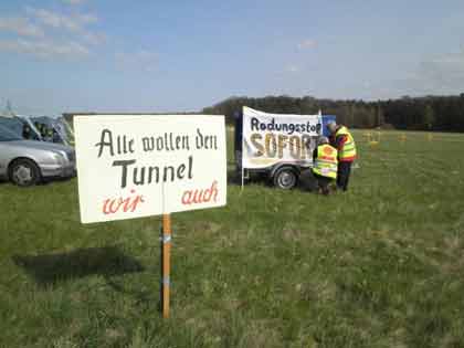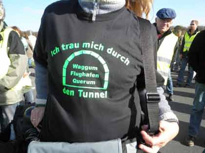 Es ist geplant, die Hauptverbindungsstrasse von Waggum nach Braunschweig ab Spätsommer ersatzlos zu kappen. Der Verkehr soll dann durch Wohngebiete abgeleitet werden. Ein Tunnelbau ist der Flughafengesellschaft zu teuer. Kurz nach dem feierlich begangenen 100. Nachmittagsspaziergang führte die Bürgerinitiative eine symbolische Tunnelbau-Wühlaktion durch. Nach wie vor haben die Polit-Maulwürfe aus Waggum eine reelle Chance, den Ausbau zu stoppen.