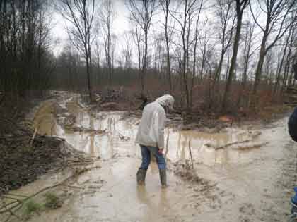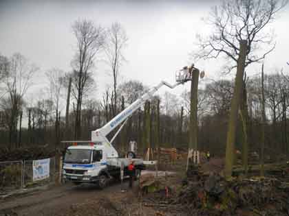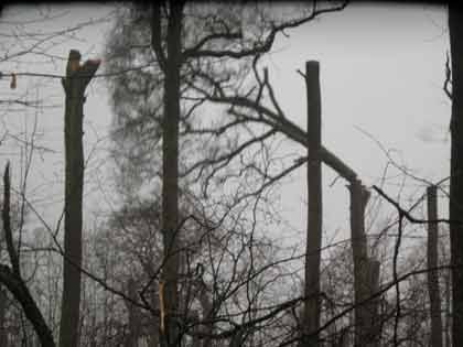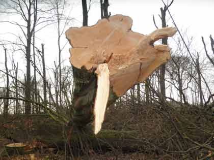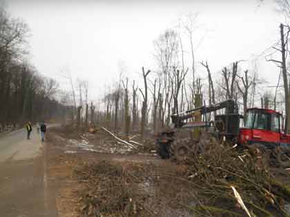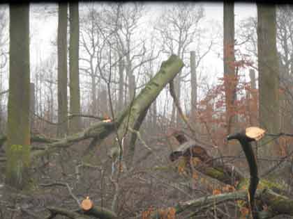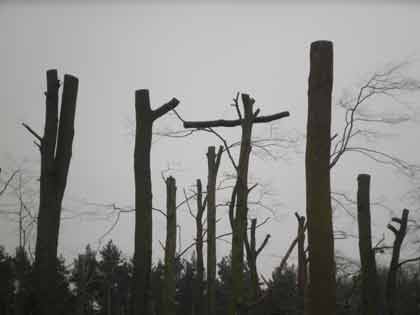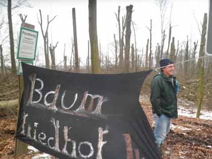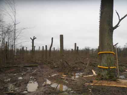 „Das sieht aus wie ein Baumfriedhof“ beschreibt der Waggumer Pfarrer Konstantin Dedekind den jetzigen Anblick des Querumer Forstes nahe der Startbahnverlängerung. Links der Tiefen Straße ragen dutzende Baumskelette in den Himmel. Auf der rechten Seite stehen grüne Firmenfahrzeuge mit Aufschriften wie „Die Förster“ oder „baumkummer.de“. Ein paar Baumkronen haben sich gehalten, aber das Gekreische von Motorsägen kündet von deren baldigem Ende. Gerade sind Mitarbeiter einer Göttinger Baumpflegefirma dabei, eine große alte Eiche in 14 Meter Höhe zu kappen. „Das wird nie mehr ein Baum sein – aber immerhin Altholz als Insektenhotel“ und: „das ist keine besonders angenehme und auch eine recht gefährliche Arbeit“ meint einer der Arbeiter. Aber offenbar lukrativ genug. Um möglichst schnell vollendete Tatsachen zu schaffen, hat die Flughafengesellschaft gleichzeitig mehrere Fällteams angeheuert, die ordentlich Geld kosten.