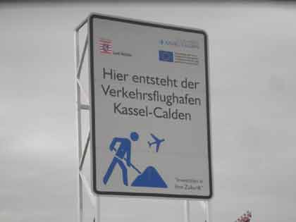 An der Bundesstrasse 7 hat das Management der Flughafen Kassel GmbH nach dem Vorbild des Berliner Grossflughafens BBI einen Infopavillion mit Aussichtsplattform errichten lassen. Die regionale Bevölkerung macht vom Baustelle-Gucken regen Gebrauch.