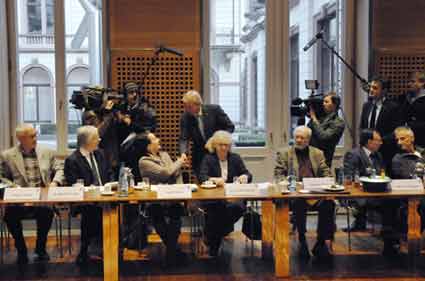 Von links nach rechts, am Tisch sitzend: Helmut Hahn, Sprecher des BBI (Darmstadt), Dr. Berthold Fuld, Sprecher des BBI (Bad Homburg), Ingrid Kopp, Sprecherin des BBI (Wiesbaden), Dr. Urusla Fechter (BIS Sachsenhausen), Nick Timm (Neu-Isenburg), Dr. Hartmut Wagner (BIL Offenbach), Dr. Michael Wilk (AKU Wiesbaden) |