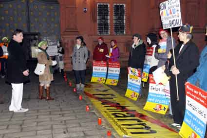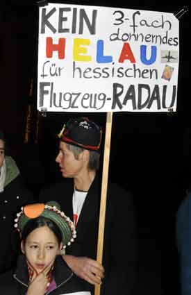 Im Mainzer Fastnachtsstil demonstrierten am Freitagabend (17. Februar) vor dem kurfürstlichen Schloß rund 70 Gegner des Frankfurter Flughafenausbaus gegen den Fluglärm über der rheinland-pfälzischen Landeshauptstadt. Drinnen fand die Direktübertragung der beliebten Fastnachtssendung "Mainz wie es singt und lacht" statt, was die Fluglärmgegner in "Mainz wie es lärmt und kracht" umformuliert hatten. Mit Plakaten und Slogans wie "Humba humba humba täterä - wir wollen keinen Fluglärm mä" verliehen sie in entspannt-fröhlicher Atmoshäre ihrem Anliegen Nachdruck und nicht wenige der das närrische Protest-Spalier auf dem Weg zur Veranstaltungen passiernden Festgäste bekundeten dafür deutliche Sympathie. Eine Besucherin versprach sogar: "Wir sehen uns am Montag im Terminal".