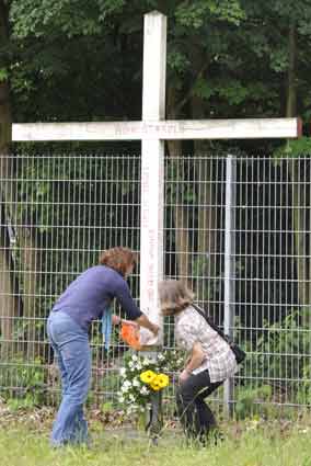 Blumen am Gedenkkreuz, das die Aufschrift trägt: "Hier starben ..."