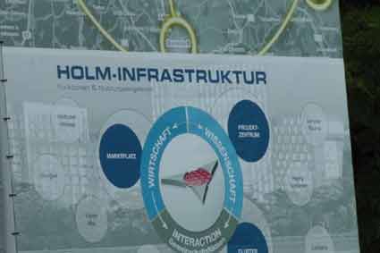 Auf dem 6500 Quadratmeter grossen Baugelände steht eine Werbestele, die sehr offen Sinn und Konzept des HoLM umreisst: Es dient der Wirtschaft (Marktplatz) und der Wissenschaft (Projektzentrum) und in gegenseitigem Austausch (Interaction) soll Einfluss auf Politik, Gesellschaft und Wirtschaftskonkurrenz genommen werden (Clusterbildung).