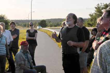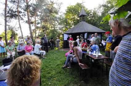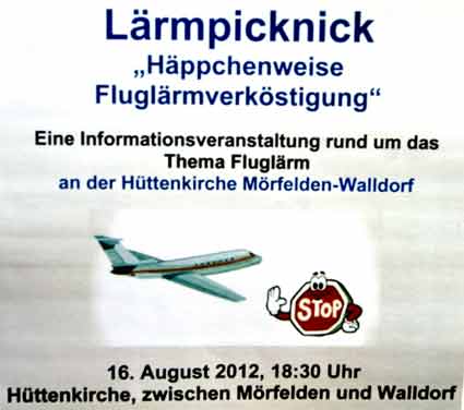 Die Hüttenkirche aus dem Flörsheimer Wald hatte die Stadt Mörfelden-Walldorf als symbolträchtigen Ort mit Wurzel bis in in die Jahre der Auseinandersetzung um die Startbahn West als Veranstaltungsort für eine Bürger-Info zur aktuellen Fluglärmbelastung und den Flughafenausbau gewählt. Bei diesem "Lärmpicknick" informierte Erster Stadtrat Franz-Rudolf Urhahn (Grüne) über die Fluglärm-Belastungen, die das Leben in beiden Stadtteile erheblich beeinträchtigen. Außerdem kündigte Urhahn den Gang der Stadt vor das Bundesverfassungsgericht zum Thema Fluglärnbelastungen an. Bei einem Rundgang konnten sich die rund 50 Teilnehmer außerdem von der Brücke an der Wageninger Straße aus als Beobachter über den An- und Abflugverkehr auf den benachbarten Airport informieren. An der Veranstaltung nahmen u.a. zahlreiche AktivistInnen teil, die sich bereits gegen den Bau der Startbahn West zur Wehr gesetzt hatten und auch heute noch gegen die Landebahn Nord-West aktiv sind.
