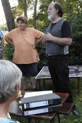 Erster Stadtrat Franz-Rudolf Urhahn berichtete in der Runde vor der Hüttenkirche, seit Jahrzehnten ein Symbol des Widerstandes gegen den Frankfurter Flughafenausbau |