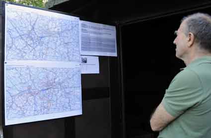 Der Mörfelder Jörg Gernandt studierte an der Tür der Hüttenkirche die Karten über die Abflugrouten und damit verbundene Belastungen |