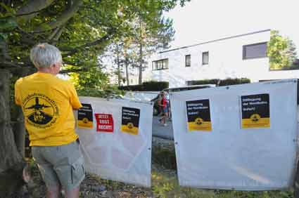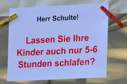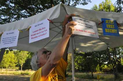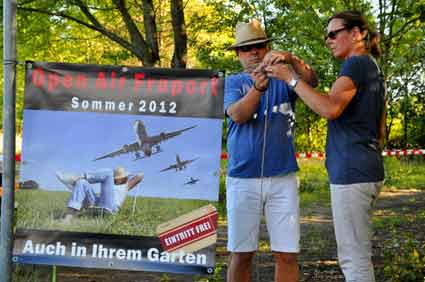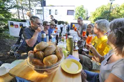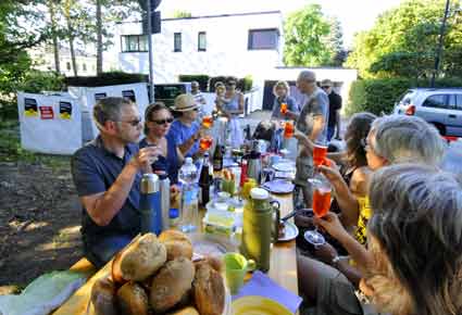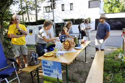 Frühstück bei Schulte Mit einer kleinen, aber feinen Aktion setzte die BI Frankfurt-Nord am Samstag, 18. August, einen neuen Farbtupfer in der Palette kreativer Protestaktionen gegen den Frankfurter Flughafenausbau: ein Frühstück vor dem Haus des Fraport-Vorsitzenden Stefan Schulte in Bad Homburg. Knapp zwei Stunden tafelten dort Teilnehmer aus dem Rhein-Main-Gebiet - von Fluglärm relativ unbelastet.