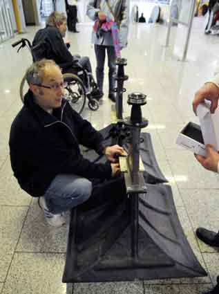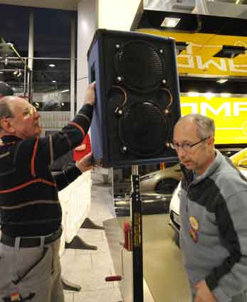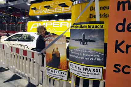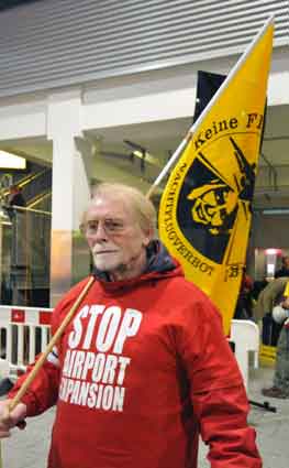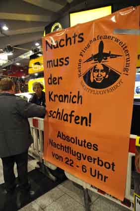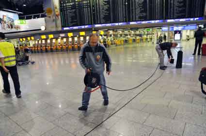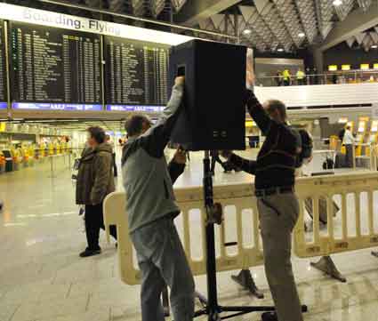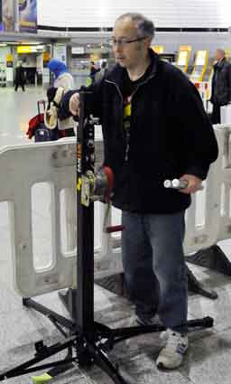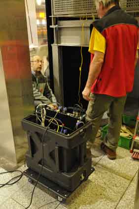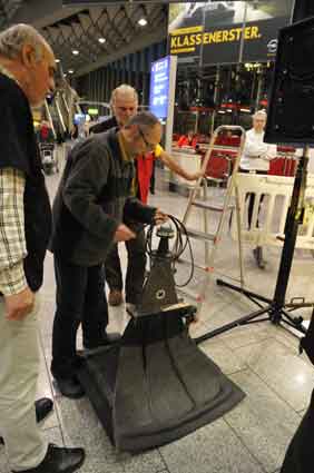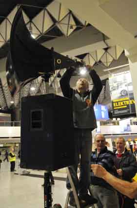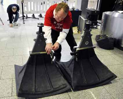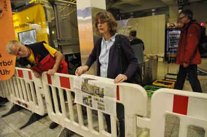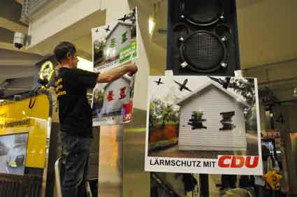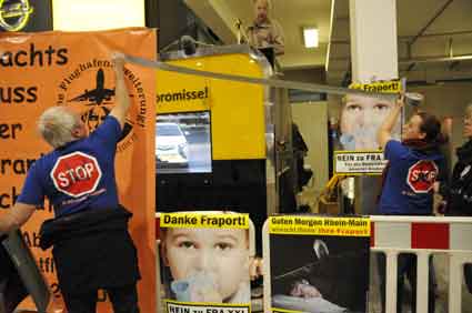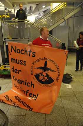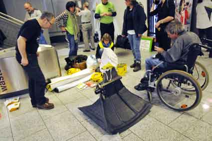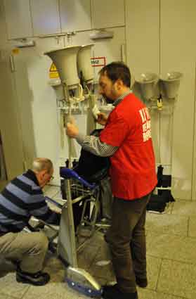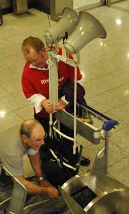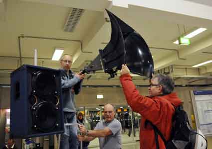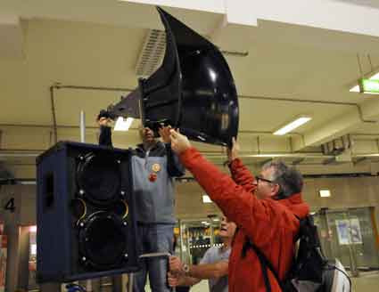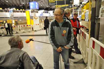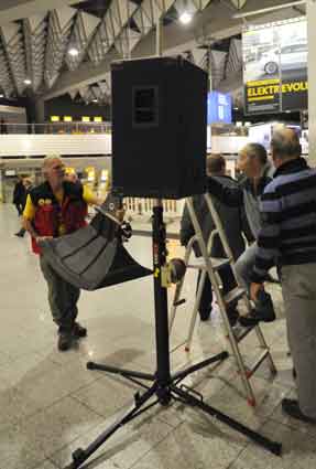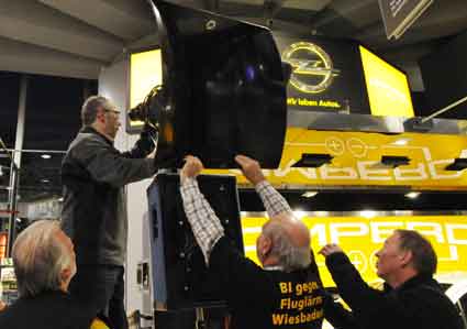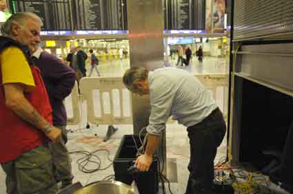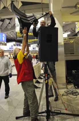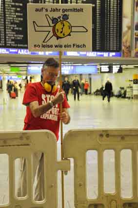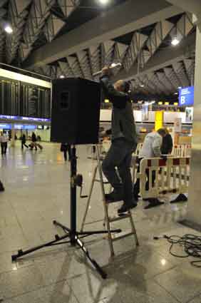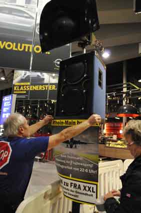 Eine Handvoll besonders Aktiver - das Aufbau-Team - wirkt meist im Hintergrund für die Großveranstaltungen des Bündnisses der Bürgerinitiativen (BBI) gegen den Frankfurter Flughafenausbau. Montag für Montag sorgen sie beispielsweise - oft von der großen Masse der Mitstreiter unbemerkt und bescheiden dafür, dass bei den Kundgebungen und Demonstrationen alles klappt, dass Lautsprecher richtig stehen und für einwandfreie Kommunikation sorgen oder dass Mikrofone richtig angeschlossen sind - und so weiter und so weiter. Eine Unzahl von Handgriffen wird schnell und fachkundig von dem gut eingespielten Team vollzogen. Mit den folgenden Fotos wollen wir einmal einen Blick hinter die Kulissen dieser enormen Arbeit ermöglichen und die Aufmerksamkeit auf das tolle Engagement dieser Aktiven lenken. Und Applaus hat das Team ganz bestimmt verdient! Meist eine knappe Stunde vor Veranstaltungsbeginn und dem offiziellen Startschuss für die Montagsdemonstrationen mit den Rednern beginnt die Arbeit des Teams, zunächst mit der Anlieferung der Geräte und Teile am und ins Terminal. Dort folgt der schweißtreibende Aufbau der teilweise gewaltigen Lautsprecheranlagen, wird für Anschluss ans Stromnetzt gesorgt, werden Leitungen verlegt und das zentrale Schaltpult sowie die Mikros installiert. Anschließend werden die Plakate und Transparente rund um die Empore angebracht und für den späteren Demonstrationszug durchs Terminal die Banner griffbereit auf dem Boden ausgebreitet. Schließlich macht man auch die tragbaren Lautsprecheranlagen für den späteren Einsatz fit und verteilt die Ordnerbinden. Irgendwie ähnelt das Ganze einer imponierenden Mischung zwischen Ameisenhaufen und gut geöltem Räderwerk. Dann endlich ist alles fertig und kann gegen 18 Uhr wieder voll die Flagge für den Protest gegen den Ausbau des Rhein-Main-Flughafens gezeigt werden. Und das - alle Montag wieder!