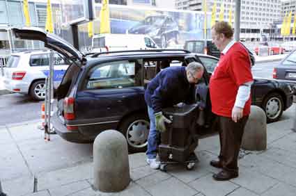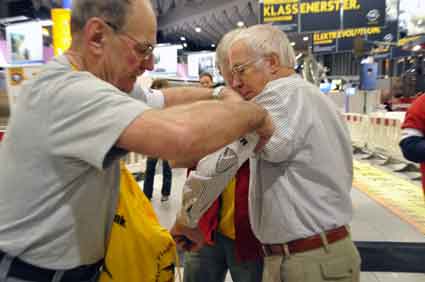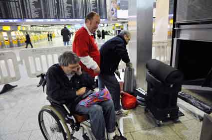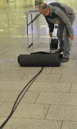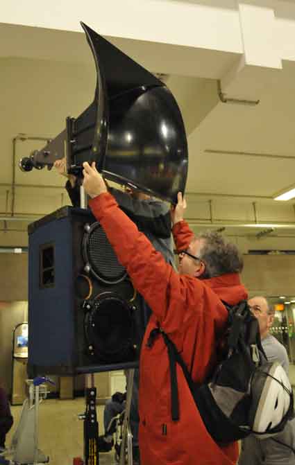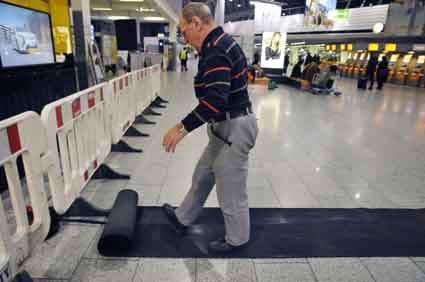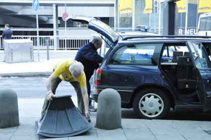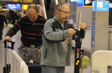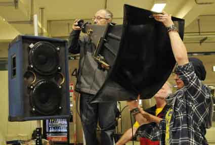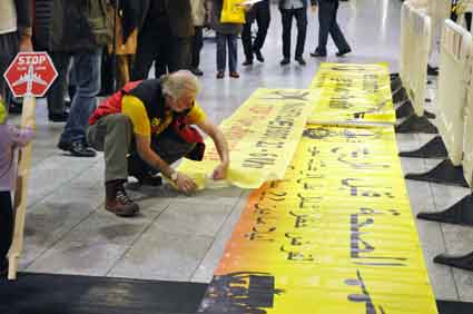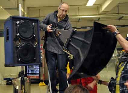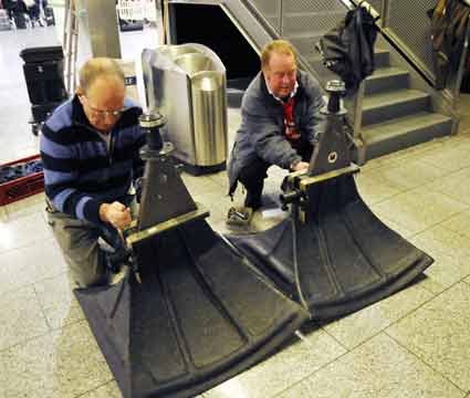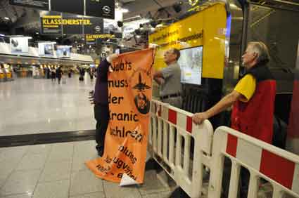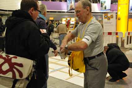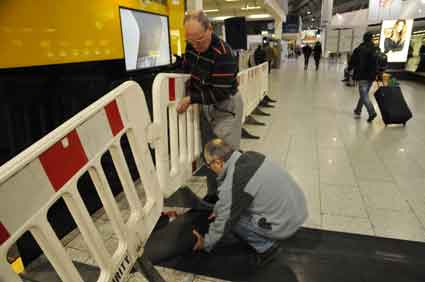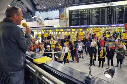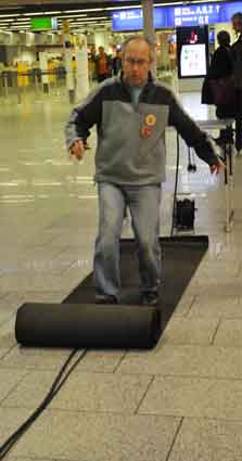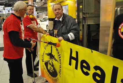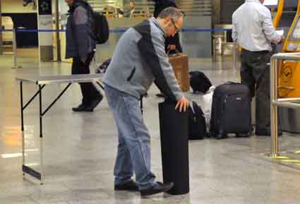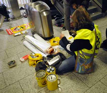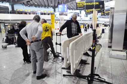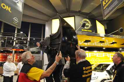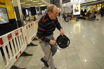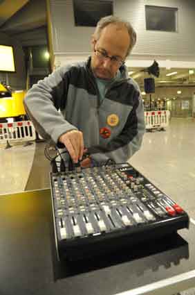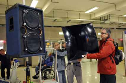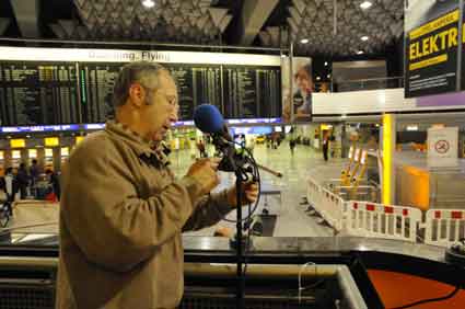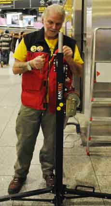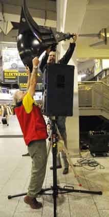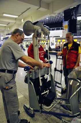 Eine Handvoll besonders Aktiver - das Aufbau-Team - wirkt meist im Hintergrund für die Großveranstaltungen des Bündnisses der Bürgerinitiativen (BBI) gegen den Frankfurter Flughafenausbau. Montag für Montag sorgen sie beispielsweise - oft von der großen Masse der Mitstreiter unbemerkt und bescheiden dafür, dass bei den Kundgebungen und Demonstrationen alles klappt, dass Lautsprecher richtig stehen und für einwandfreie Kommunikation sorgen oder dass Mikrofone richtig angeschlossen sind - und so weiter und so weiter. Eine Unzahl von Handgriffen wird schnell und fachkundig von dem gut eingespielten Team vollzogen. Mit den folgenden Fotos wollen wir einmal einen Blick hinter die Kulissen dieser enormen Arbeit ermöglichen und die Aufmerksamkeit auf das tolle Engagement dieser Aktiven lenken. Und Applaus hat das Team ganz bestimmt verdient! Meist eine knappe Stunde vor Veranstaltungsbeginn und dem offiziellen Startschuss für die Montagsdemonstrationen mit den Rednern beginnt die Arbeit des Teams, zunächst mit der Anlieferung der Geräte und Teile am und ins Terminal. Dort folgt der schweißtreibende Aufbau der teilweise gewaltigen Lautsprecheranlagen, wird für Anschluss ans Stromnetzt gesorgt, werden Leitungen verlegt und das zentrale Schaltpult sowie die Mikros installiert. Anschließend werden die Plakate und Transparente rund um die Empore angebracht und für den späteren Demonstrationszug durchs Terminal die Banner griffbereit auf dem Boden ausgebreitet. Schließlich macht man auch die tragbaren Lautsprecheranlagen für den späteren Einsatz fit und verteilt die Ordnerbinden. Irgendwie ähnelt das Ganze einer imponierenden Mischung zwischen Ameisenhaufen und gut geöltem Räderwerk. Dann endlich ist alles fertig und kann gegen 18 Uhr wieder voll die Flagge für den Protest gegen den Ausbau des Rhein-Main-Flughafens gezeigt werden. Und das - alle Montag wieder!