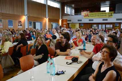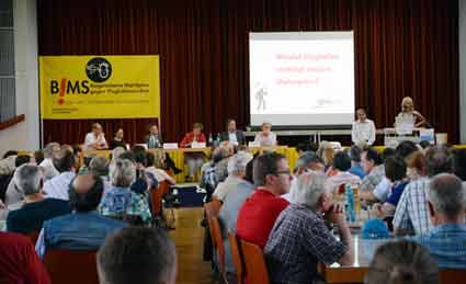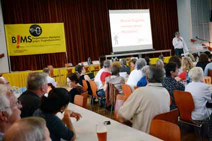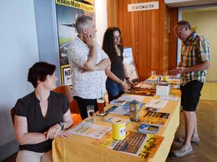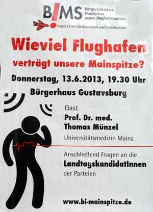 Das Thema Frankfurter Flughafenausbau füllt wieder große Säle! So besuchten 350 Bürger/innen am Donnerstagabend im Bürgerhaus Gustavsburg (Kreis Groß-Gerau) den Info- und Diskussionsabend der Bürgerinitiative Mainspitze gegen Flughafenausbau (BIMS) im BBI. Unter dem Motto "Wie viel Flughafen verträgt unsere Mainspitze?" wurden zahlreiche Infos vermittelt. Dazu zählte vor allem auch ein Referat von Prof. Dr. med. Thomas Münzel, Universitätsmedizin Mainz, über die negativen gesundheitlichen Auswirkungen des Jet-Gedröhns für die darunter lebenden Menschen. Außerdem trugen Bürger/innen der Mainspitzengemeinden in beeindruckender Form ihre Sorgen, Nöte und Erfahrungen mit dem nach übereinstimmernder Meinung stark angestiegenen Fluglärm über ihrer Heimat vor. Außerdem fand eine von Oleg Cernavin moderierte Podiumsdiskussion statt, an der die fünf Wahlkreis-Kandidaten/innen der im Landtag vertretenen Parteien und Heiko Holefleisch als Vertreter der BIMS teilnahmen.