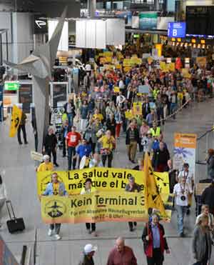 Freude darüber, dass die schwarz-gelbe Landesregierung in Wiesbaden abgewählt worden ist, bestimmte in viele Beiträgen - in Reden und auf Plakaten - die erste Montagsdemo nach der Hessenwahl am 22. September 2013. Zu dieser insgesamt nunmehr 73. Montagsdemo der Ausbaugegner/innen des Rhein-Main-Flughafens hatte das Bündnis der Bürgerinitiativen (BBI) aufgerufen und über 1000 Bürger/innen aus dem gesamten Ballungsgebiet waren dazu ins Terminal 1 gekommen. Sprecher/innen des BBI ließen keinen Zweifel daran aufkommen, dass - unabhängig vom Ausgang der hessischen Landtagswahl - die Proteste weitergehen, bis ein aus Sicht der Bürgerinitiativen zufrieden stellendes Ergebnis für die von Fluglärm geplagten Menschen erreicht worden ist. Laut BBI-Moderator Jochen Krauß sind vorsorglich bereits alle Montagsdemonstrationen bis zum Zusammentreten des neuen Wiesbadener Landtags im Januar 2014 angemeldet worden.