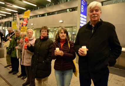 | Advent Advent - ein Lichtlein brennt, das hatte bei der letzten, vom Bündnis der Bürgerinitiativen (BBI) veranstalteteten Montagsdemo im Alten Jahr eine besondere Bedeutung: Bei Kerzenschein und mit einer Lichterkette vor dem Terminal präsentierten die Demonstranten ihren Wunschzettel 2014. Gerichtet war der symbolisch an den Weihnachtsmann mit der Bitte "bringe uns": die Stilllegung der Landebahn Nordwest, ein Nachtflugverbot von 22 bis 6 Uhr, Begrenzung der jährlichen Flugbewegungen auf 380000 sowie einen Ausbaustopp für das geplante Terminal 3. |
