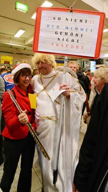 Der Protest, um konkrete Verbesserungen für die vom Fluglärm geplagte Bevölkerung zu erreichen, lebt über den Jahreswechsel hinaus! Immerhin war dies im Terminal die nunmehr dritte vom BBI veranstaltete vorweihnachtliche Protestaktion des BBI, was viele vor Jahren kaum für möglich gehalten hatten. "Wenn es sein muss, kommen wir dazu auch die nächsten fünf Jahre noch", versprach unter zustimmendem Beifall Jochen Krauß für das Bündnis der Bürgerinitiativen am Montagabend. Schon am Rande der Grüne-Mitgliederversammlung über die schwarz-grünen Koalitiosvereinbarung, was am Samstag, 21. Dezember, in Frankfurt erfolgen soll, wollen sich die Bürgerinitiativen mit einer Protestaktion für die weitere Zukunft vorsorglich politisch warmlaufen.