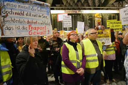 "Das ist die 83. Montagsdemo", sagte Mela Krauß als BBI-Moderatorin im Terminal des Rein-Main-Flughafens, wohin der Dachverband der Bürgerinitiativen für den 16. Dezember aufgerufen hatte. 1400 Demonstranten aus dem Ballungsgebiet waren gekommen, um buchstäblich am Vorabend des vermutlichen schwarz-grünen Koalitionsvertrages für die neue hessische Landesregierung zu dokumentieren: Diese Protestbewegung lebt weiter und wird sehr aufmerksam beobachten, was in Wiesbaden wirklich in Sachen Fluglärm, Airportausbau usw. passiert.