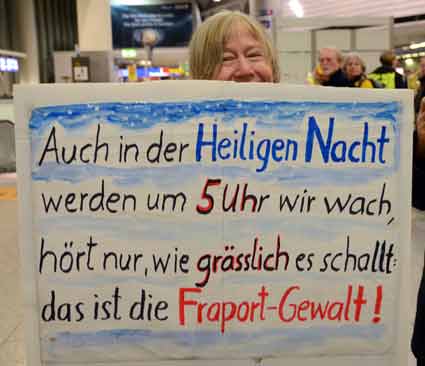 | Mit Solosängern, Gemeinschaftschor und vielen Instrumenten wurde beim stimmungsvollen Protest-Weihnachtskonzert im Terminal unter anderem vorgetragen: "Stille Nacht, fünf Uhr acht - Deutschland schläft, wir sind wach - 300 Flieger, die Nerven sind blank - Das Haus ist wertlos, wir werden krank. - Lasst uns endlich in Ruuuuh - Maaacht die Landebahn zu" |