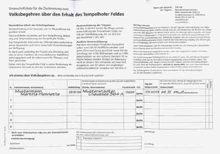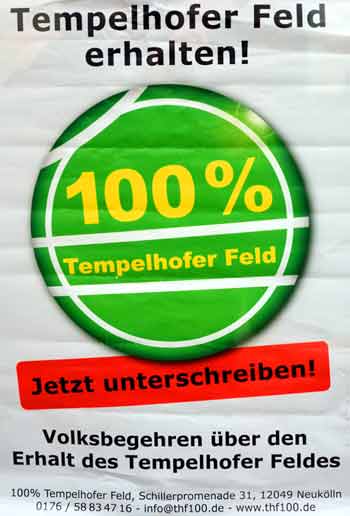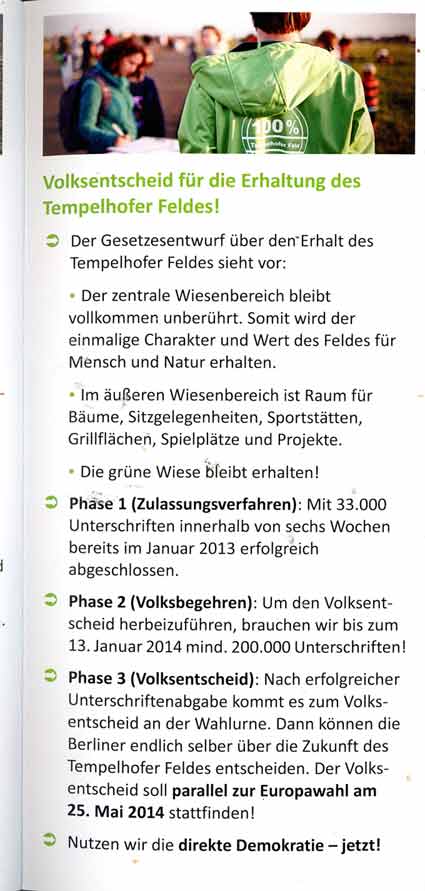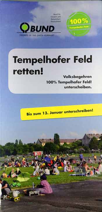 Rund 200.000 Unterschriften wollen die Aktiven der gemeinnützigen Demokratischen Initiative "100 % Tempelhofer Feld e.V." bis zum 13. Januar 2014 hierfür sammeln und waren dazu auch an den zurückliegenden Weihnachtstagen aktiv. Aufmerksam und mit viel Sympathie werden die enormen Bemühungen, die Voraussetzung für einen späteren Volksentscheid gegen die vom Berliner Senat geplante Bebauung des als beliebtes Freizeit- und Naherholungsgebiet genutzten Areals sind, auch beim gegen den Frankfurter Flughafenausbau kämpfenden Bündnis der Bürgerinitiativen verfolgt. Im Sommer 2013 hatte eine Delegation des BBI das Tempelhofer Feld und die Demokratische Initiative besucht.