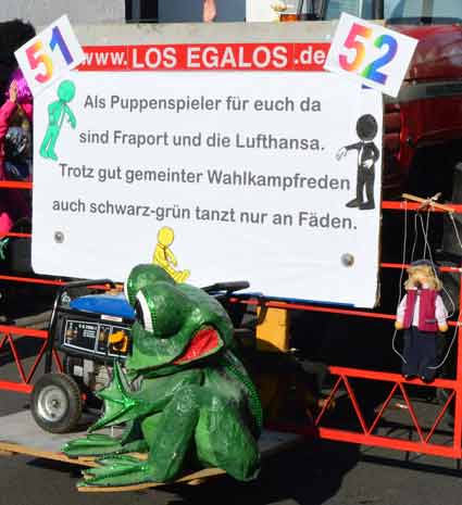 Der umstrittene Frankfurter Flughafenausbau wurde auch in diesem Jahr wieder an Fastnacht mancherorts närrisch unter die Lupe genommen. So war dies beispielsweise beim sonntäglichen Fastnachtszug am 2. März 2014 in der karnevalistischen Hochburg Flörsheim mit einigen Zugnummern der Fall. Unsere Fotos zeigen Szenen vom Umzug durch die Straßen der stark von Fluglärm gebeutelten Stadt.