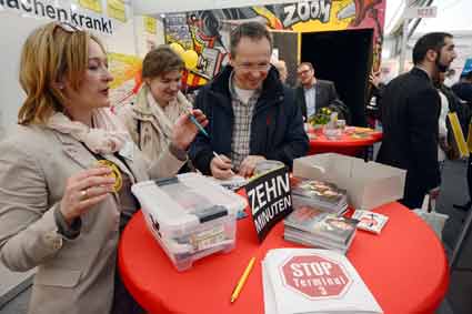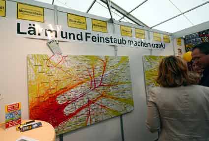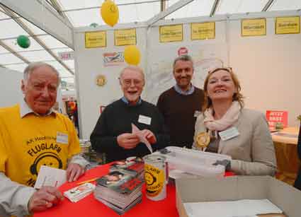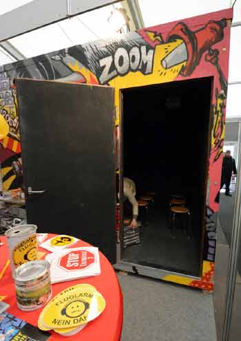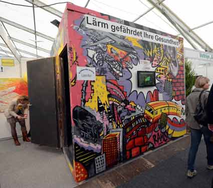 Text: Gemeinsam präsentieren bei der "Rheinland-Pfalz-Ausstellung 2014" in Mainz drei Bürgerinitiativen aus der Domstadt und Rheinhessen aktuelle Infos zum heißen Eisen Fluglärm und zum Protest gegen den Frankfurter Flughafenausbau. Und sie tun das auf ungewöhnliche Art und Weise in der Gesundheitshalle 5c, am Stand 23. Dorthin laden der Verein Lebenswertes Mainz und Rheinhessen, die Fluglärm-Initiative Mainz-Oberstadt sowie die Initiative gegen Fluglärm in Rheinhessen ein. Die Attraktion ist eine überdimensionale Lärmbox, die mehreren Besuchern Raum bietet. Darin werden in einer vier-minütigen Sequenz eindrucksvoll Geräusche und Bilder zur Lärmbelästigung von oben simuliert, so wie sie in der Reailität viele Einwohner ringsum Mainz und dort selbst ertragen müssen. Diese Lärmbox war erstmals beim evangelischen Kirchentag 2013 in Hamburg viel beachtet eingesetzt gewesen. Neben der Lärmbox organisierten die unter dem Dach des gegen den Frankfurter Flughafenausbaus kämpfenden Bündnisses der Bürgerintiaitiven (BBI) verbundenen Gruppen bei der am Samstag, 22. März, eröffnetem Ausstellung auch eine große Postkartenaktion. Die richtet sich besonders gegen das geplante Terminal 3, welches die Fluglärmbelastungen im Ballungsgebiet aufgrund der hierdurch möglichen noch mehr Flugbewegungen weiter verschärfen würde. Teilnehmer an der gut vorbereiteten Postkartenaktion konnten selbst wählen, ob sie lieber Bundeskanzlerin Angela Merkel, Hessens Ministerpräsident Volker Bouffier oder anderer Polit-Prominenz mit ihren Protestsendungen den Briefkasten füllen wollen. Darüber hinaus bieten BI-Aktive am Stand 23 aber noch reichlich Infos zu Flugrouten, Feinstaub-Gefahren und anderem mehr. Das Echo der Besucher war schon am ersten Tag erfreulich gut. Bis zum 30. März dauert die Landesausstellung an.