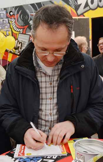 Dietrich Elsner präsentierte den Besuchern mit diesen Karten eine Art Royal Flush des Protestes an Polit-Prominenz |