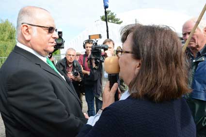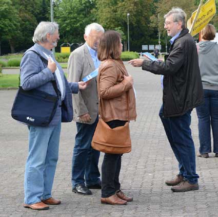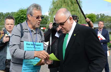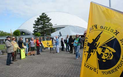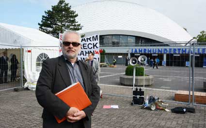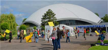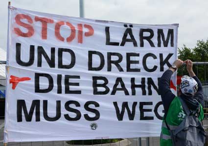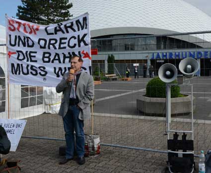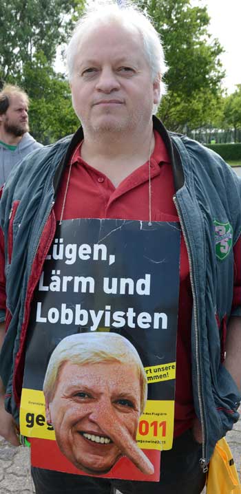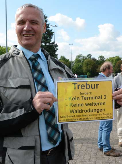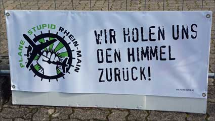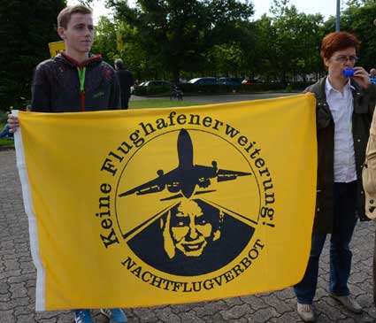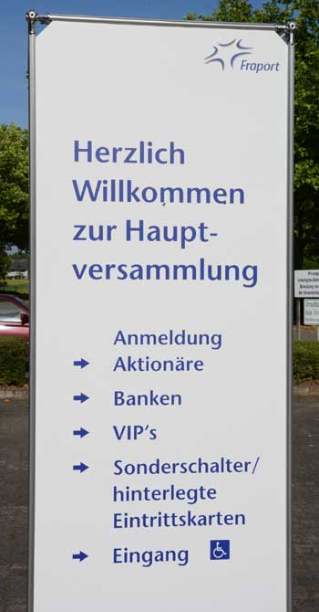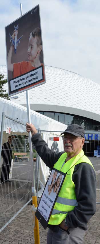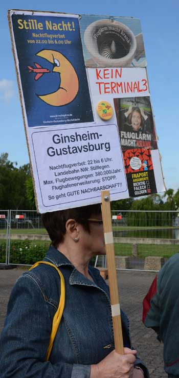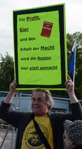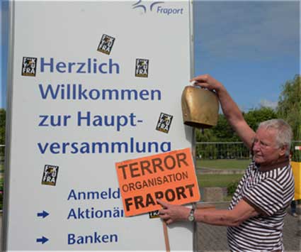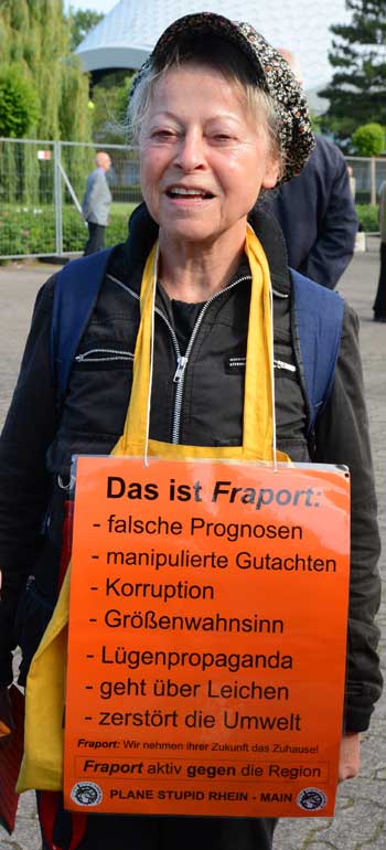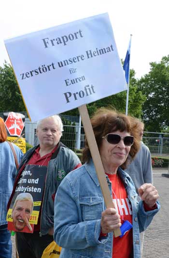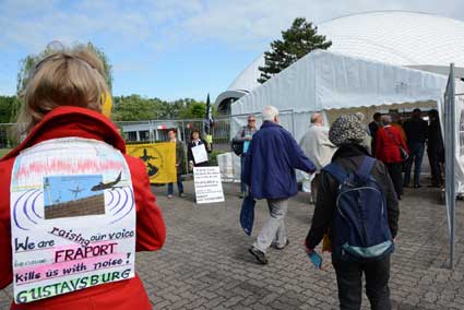 In Frankfurt-Höchst protestierten am Freitagmorgen (30. Mai 2014) Ausgegner/innen des Frankfurter Flughafens vor der Jahrhunderthalle, in der die Hauptversammlung 2014 der Flughafenbetreibergesellschaft Fraport stattfand. Mit Plakaten, Sprechchören, Trommeln und Pfeifen machten die Protestierenden von etwa 9 bis 10.30 Uhr ihren Unmut deutlich, forderten beispielsweise eine deutliche Reduzierung des Fluglärms und keinen weiteren Ausbau des Airports. Zur Versammlung angereiste Fraport-Aktionäre mussten teilweise regelrecht Spalier laufen, um zum Versammlungsort zu gelangen, begleitet von Rufen wie “Ihr Reichtum geht auf Kosten unserer Gesundheit” sowie durch Lautsprecher übertragene Geräusch auf den Rhein-Main-Flughafen ein- oder von dort abdonnernder Jets. Kritik, teilweise lautstark vorgetragen, gab es vor allem auch an der politischen Rolle der Grünen in Hessen, was beispielsweise der Grüne-Landtagsabgeordnete Frank Kaufmann zu spüren bekam. Unter den Demonstrierenden waren Mitstreiter aus diversen Kommmunen und Bürgerinitaitiven, so Jan Wunderlich aus Trebur, Dieter Neumann aus Groß-Gerau, Peter Illert aus Dreieich, Arno Treutel aus Kelsterbach, Knut Dörfel aus Sachsenhausen, Dirk Treber (Interessengemeinschaft zur Bekämpfung des Fluglärms IGF), einer der Vertreter der kritischen Fraport-Aktionäre und etliche weitere MitstreiterInnen
