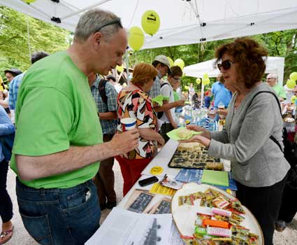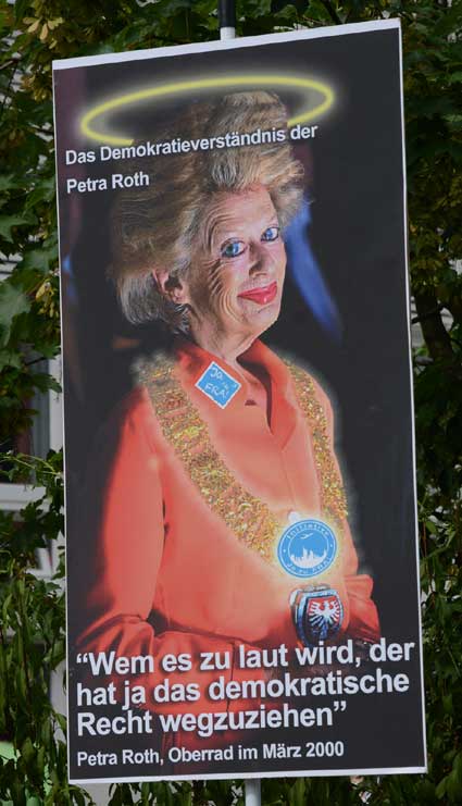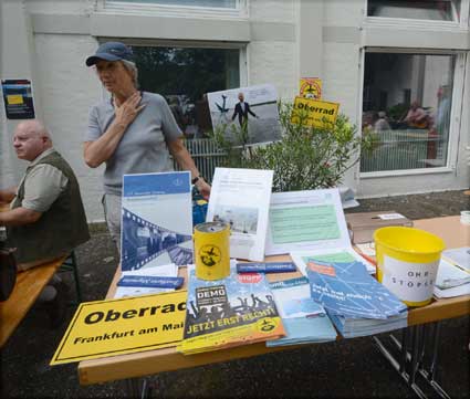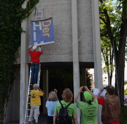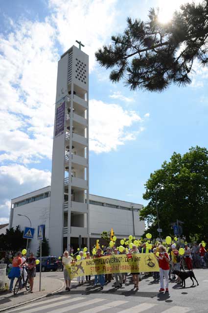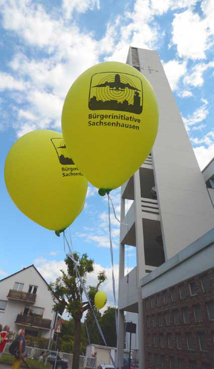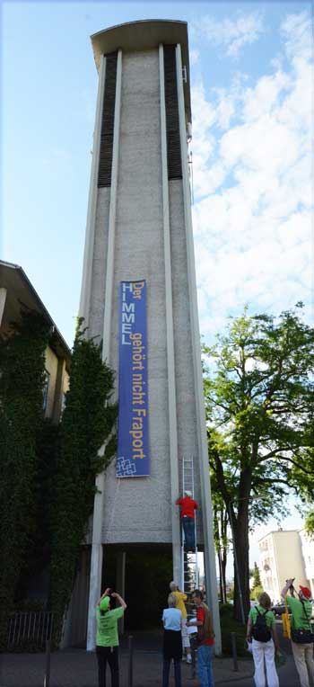 Lärmspaziergang von Sachsenhausen nach Oberrad Den Start frei gaben für einen sonntäglichen Lärmspaziergang die unter dem Dach des gegen den Ausbau des Rhein-Main-Flughafens kämpfenden Bündnisses der Bürgerinitiativen (BBI) organisierten Frankfurter Bürgerinitiativen, die sich aus mehreren Stadtteilen zu gemeinsamen Aktionen unter dem Kürzel “F.B.I.” zusammengeschlossen haben. Diese drei Buchstaben stehen für “Frankfurter Bürgerinitiativen”. Etwa 400 Ausbaugegner/innen nahmen am Sonntag, 15. Juni 2014 teil an der mehrstündigen Protestaktion, die drei Stationen verband: Die Route reichte von der Bergkirche der evangelischen Dreikönigsgemeinde in Sachsenhausen mit einem ungewöhnlichen Turmgebet über den beliebten Ausflugspunkt Goethe-Turm und schließlich zur Erlöserkirche der evangelischen Erlöser-Gemeinde am Melanchthon-Platz in Oberrad. Dort wurde am Ende der Aktion das Transparent “Der Himmel gehört nicht Fraport” am Kirchturm enthüllt.
