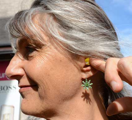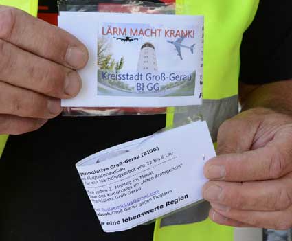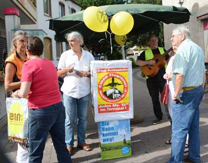 Auch in der Ferienzeit ist die Groß-Gerau Bürgerinitiative gegen den Flughafenausbau (BIGG) aktiv. Dies bewies sie mit ihrem nunmehr dritten Info-Stand in der Innenstadt, wo sie am Samstag. 9. August 2014, mit Marktschirm, viel Info-Material, Luftballons und Musik auf sich und ihr Anliegen aufmerksam machte (Bild 1). Gleichzeitig war dies die Premiere für den neuen “Groß-Gerauer Infostöpsel”. Der wurde verpackt (Bild 2) mit Infos und dem Logo der BI der Kreisstadt an die Passanten übergeben, konnte dann (Bild 3) direkt lärmmindernd ins Ohr eingesetzt werden – der Wandel vom Infostöpsel zum Ohrstöpsel!
