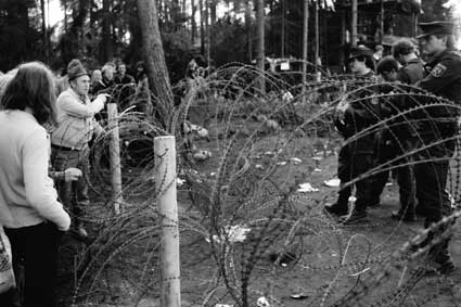 Im Herbst 1981 am Nato-Draht auf dem Sieben-Hektar-Gelände an der Okifteler Straße: Walter Raiss im Dialog mit der Polizei |