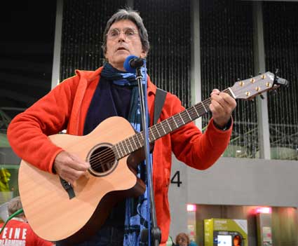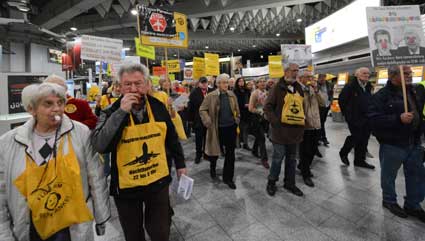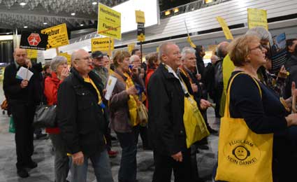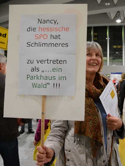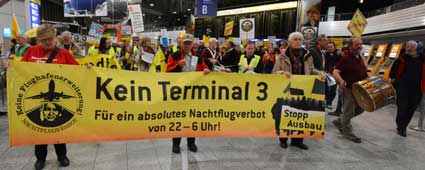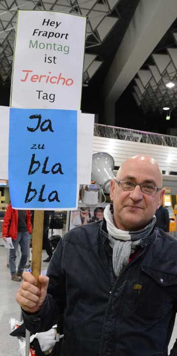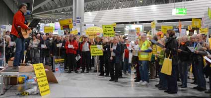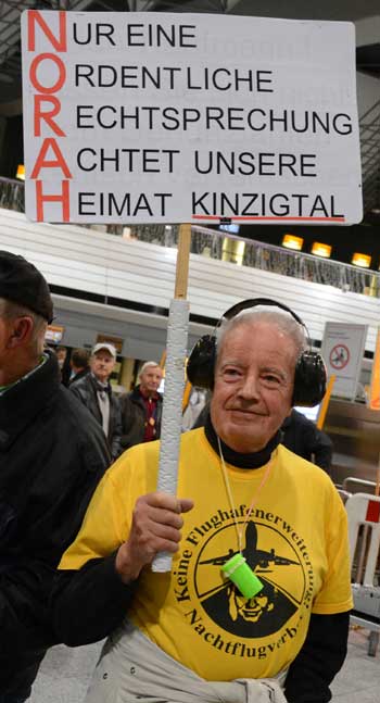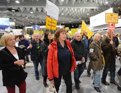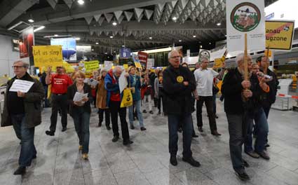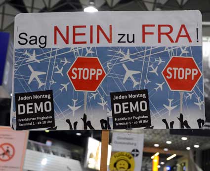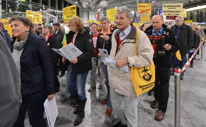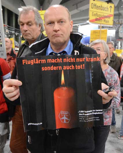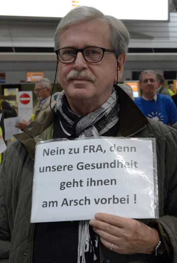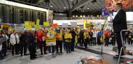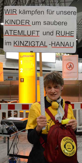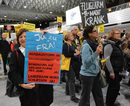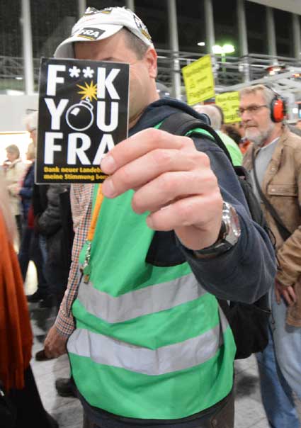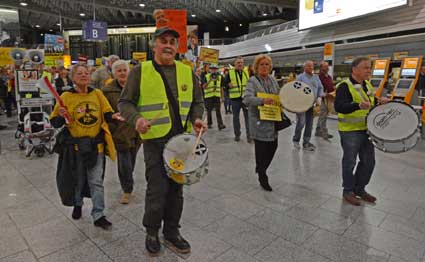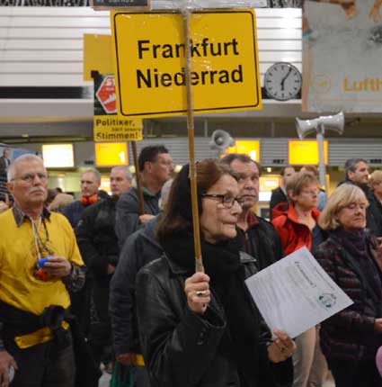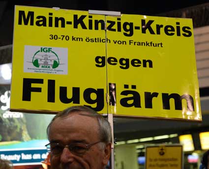 Die 116. Montagsdemo des gegen den Ausbau des Rhein-Main-Flughafens kämpfenden Bündnisses der Bürgerinitiativen (BBI) wurde am 10. November 2014 von der “Interessengemeinschaft Fluglärm Hanau – Kinzigtal (IGF – MKK)” organisiert. Deren Sprecher Eric Ludwig war Moderator und Hauptredner des Abends, beschäftigte sich unter anderem kritisch mit der DFS. Matthias Wesche trug zur Gitarrer kritische Songs zum Flughafenausbau vor, wobei der Song “Zusammen” – bei dem viele Demonstranten im Terminal mitsangen – Symbol-Charakter für die Protestbewegung und ihre Anliegen hatte. Außerdem verteilte Greenpeace Infos zum Freihandelsabkommen TTIP und sammelte Unterschriften hiergegen.