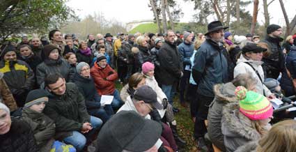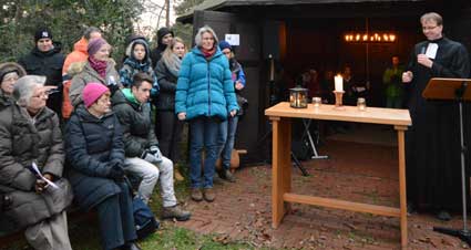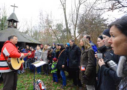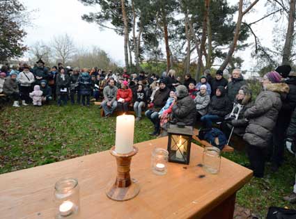 Seit 28 Jahren heißt es im besten weihnachtliche Sinne “Alle Jahre wieder” an der 1986 am Vitrolles-Ring in Mörfelden-Walldorf wieder aufgebauten Hüttenkirche, die aus dem einstigen Hüttendorf im Flörsheim Wald stammt, wo die Ausbaugegner/innen des Rhein-Main-Flughafens ein Zentrum des Protestes eingerichtet hatten. Bei den alljährlichen Weihnachtsgottesdiensten an dem Holzkirchlein, das sich in diesem Jahr mit renoviertem Glockenstuhl präsentierte, stehen traditionell gesellschaftspolitische, soziale und ökologische Themen Im Mittelpunkt. Auch zum 24. Dezember 2014 hatten die evangelischen Kirchengemeinden von Mörfelden und Walldorf, die gemeinsam die Hüttenkirche betreuen und verwalten, zum Heilig Abend eingeladen und über 150 Teilnehmer aus dem gesamten Rhein-Main-Gebiet waren gekommen.